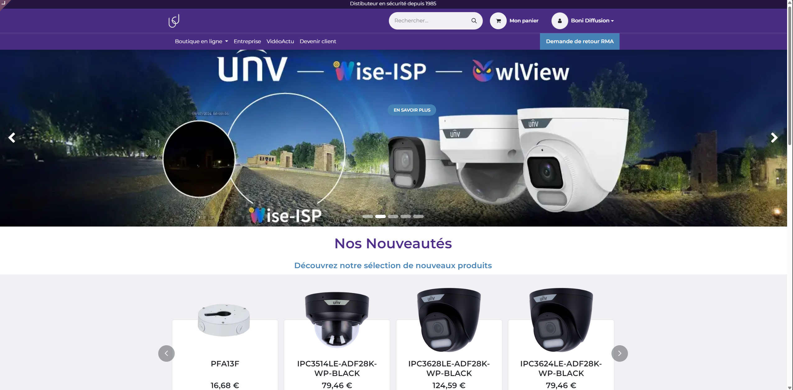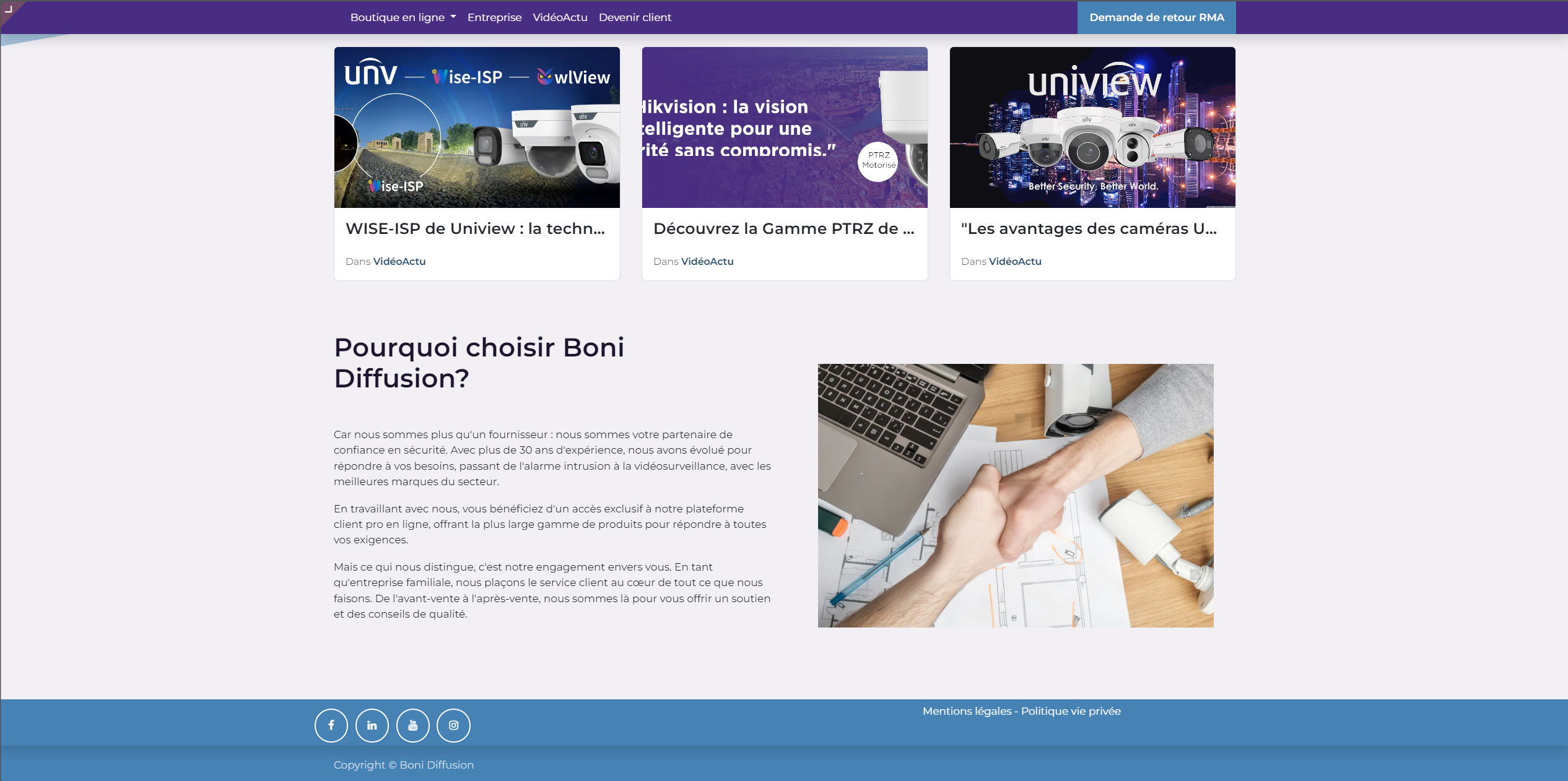 Le site de Boni Diffusion, créé avec Odoo par Okamilink, est une vitrine professionnelle destinĂ©e aux clients souhaitant acquĂ©rir du matĂ©riel de vidĂ©osurveillance. Il met en avant les produits et services de l’entreprise, avec une navigation fluide et un design Ă©purĂ©.