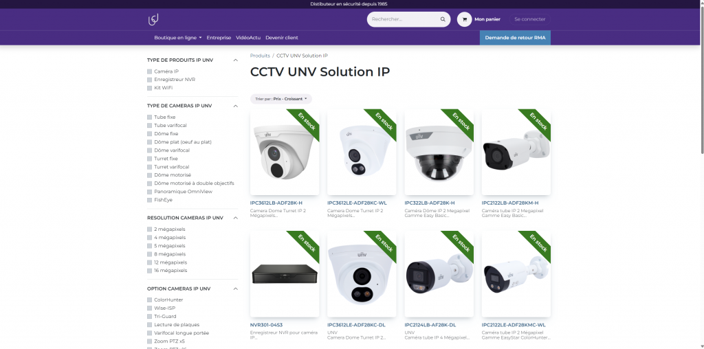 🟣 Catalogue produit → PrĂ©sentation dĂ©taillĂ©e des Ă©quipements de vidĂ©osurveillance : camĂ©ras, enregistreurs, accessoires, etc.