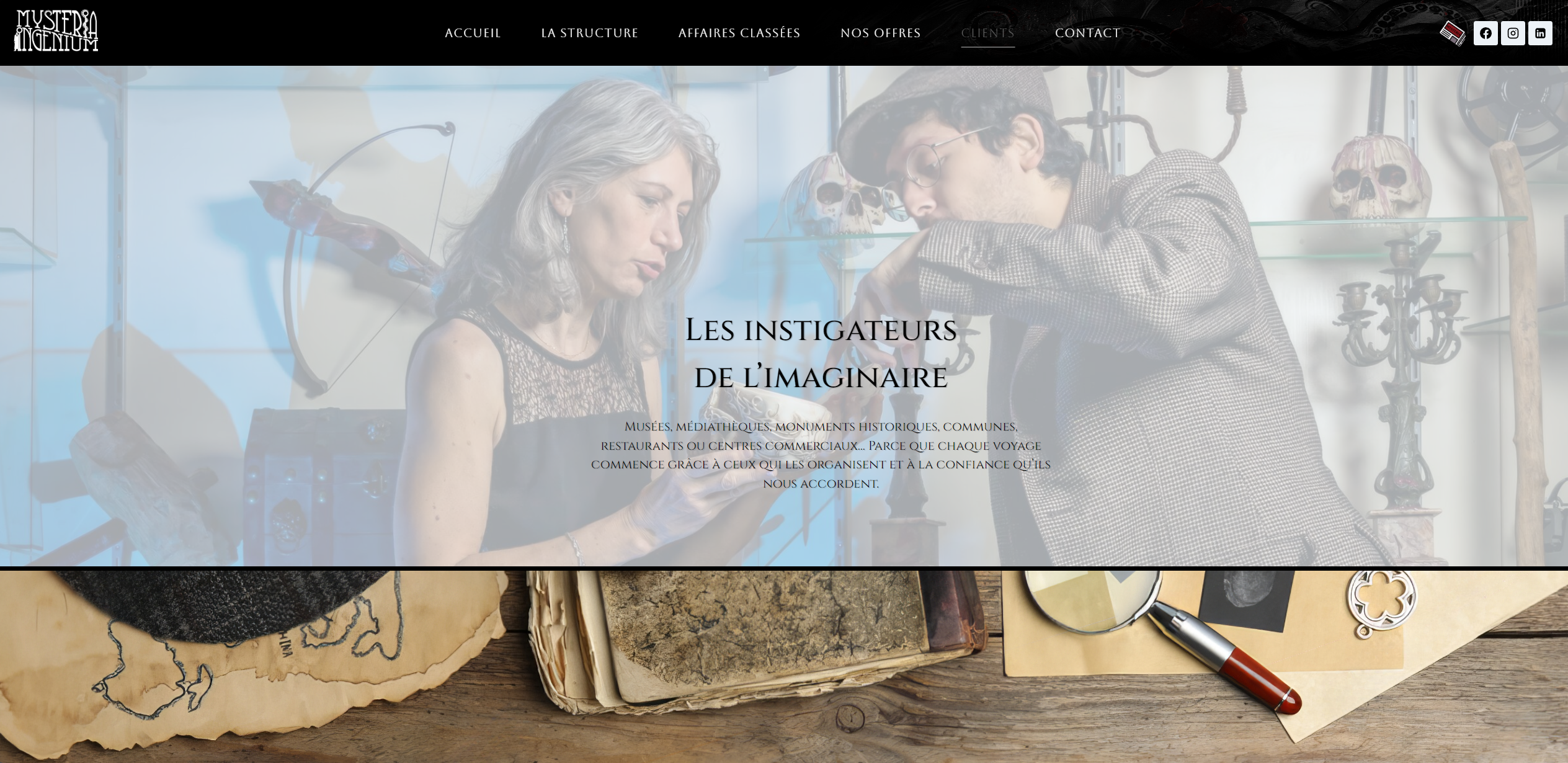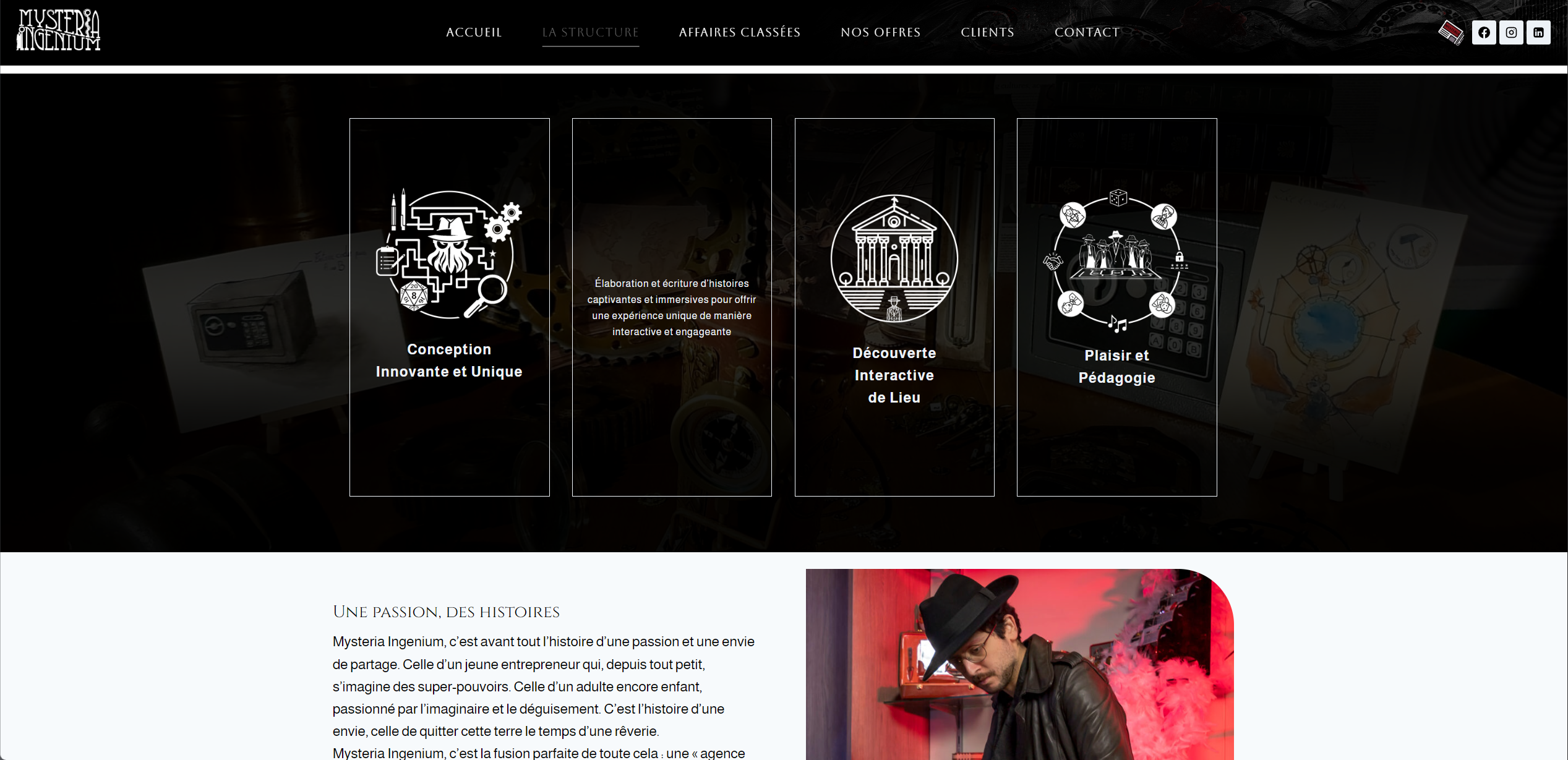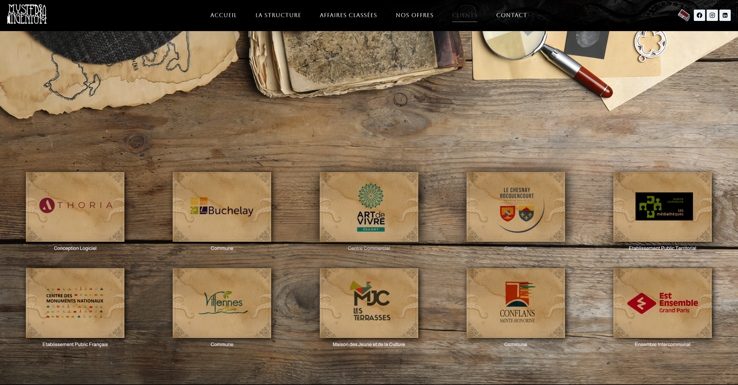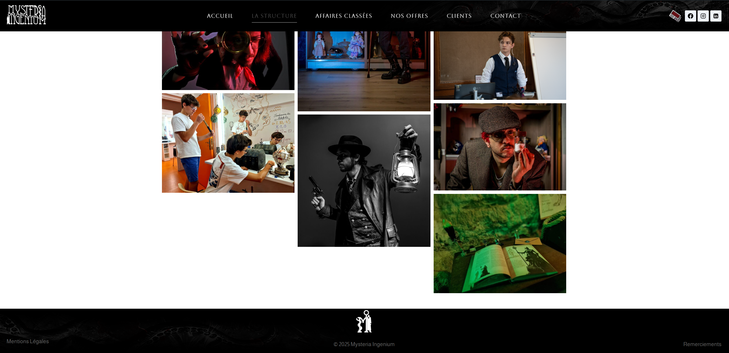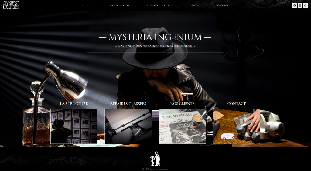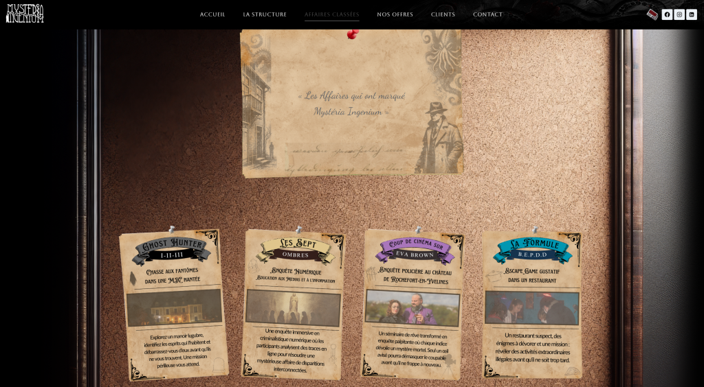 🔍 Section « Affaires ClassĂ©es » : Cette partie du site prĂ©sente des rĂ©sumĂ©s d’enquĂȘtes passĂ©es, racontĂ©es de maniĂšre Ă  intriguer et Ă  donner envie aux visiteurs de participer. L’accent est mis sur des histoires captivantes et des scĂ©narios de jeux d’enquĂȘte qui ont eu lieu, offrant une immersion dans l’univers de Mysteria Ingenium.