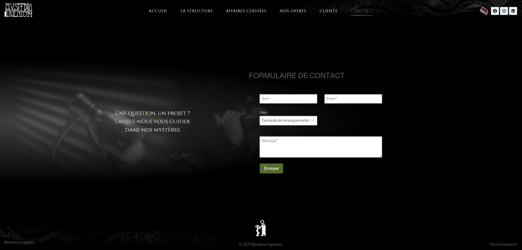 En rĂ©sumĂ©, le site de Mysteria Ingenium créé par Okamilink propose une expĂ©rience immersive centrĂ©e sur des jeux d’enquĂȘte, avec une navigation fluide, une ambiance mystĂ©rieuse et un formulaire de contact pratique pour obtenir des informations ou faire une demande.