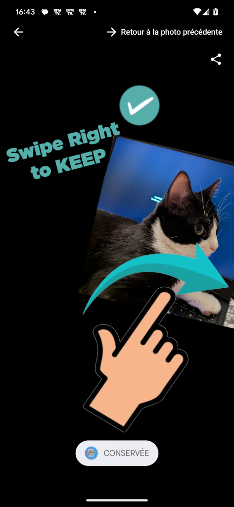 Swipe intuitif : glissez Ă  droite pour garder, Ă  gauche pour supprimer.